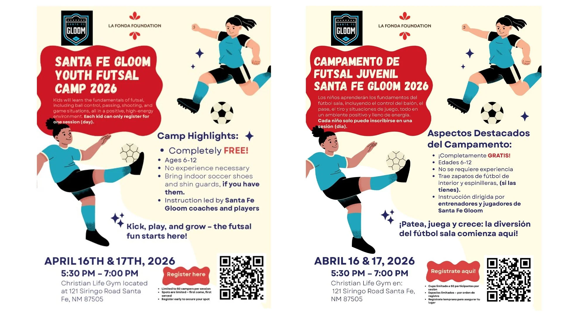 SANTA FE, NM - The Santa Fe Gloom Youth Futsal Camp is a free camp for kids ages 6–12 to learn futsal in a fun, positive, and high-energy environment. Led by Santa Fe Gloom coaches and players, campers will work on ball control, passing, shooting, and game situations. The camp takes place April 16 and 17 from 5:30 PM to 7:00 PM at Christian Life Gym in Santa Fe. Spots are limited to 50 campers per session, and each child may register for one day only. Please bring indoor soccer shoes and shin guards if you have them. Thank you to our camp sponsor, La Fonda Foundation, for helping make this free camp possible.